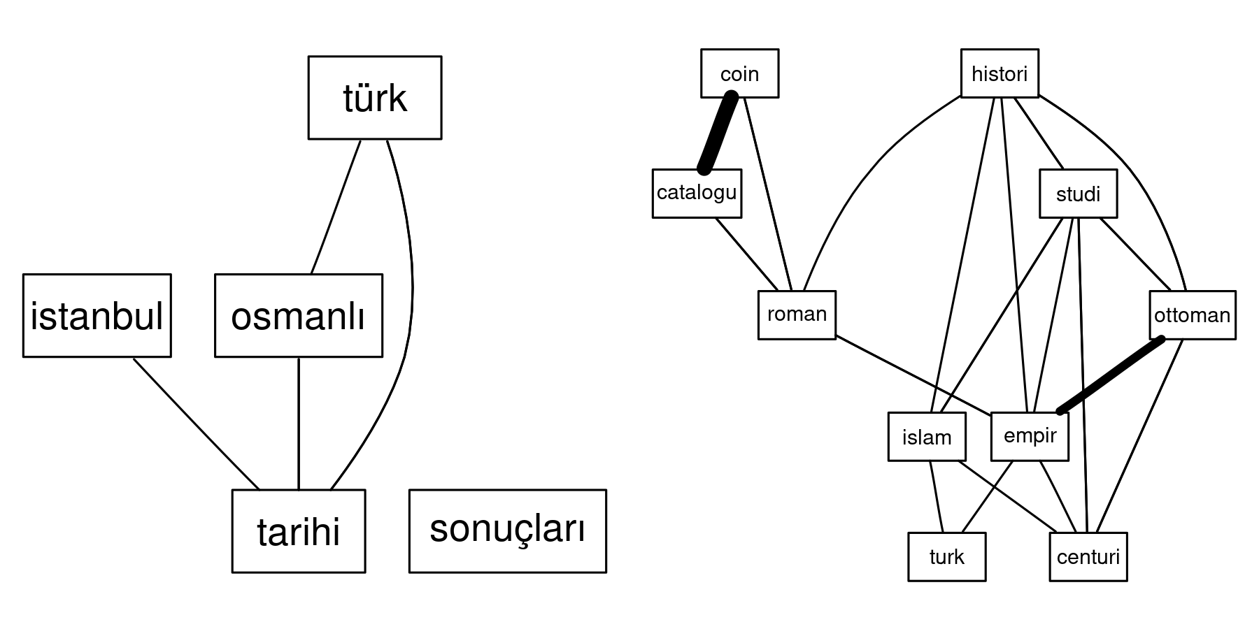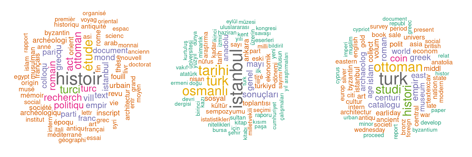 Sans trop de surprises, les mots tels que histoire, turc, Istanbul, ottoman, ville, urbain, archéologie, architecture ou fouilles sont les mots qui apparaissent le plus fréquemment dans les titres. Ils sont néanmoins assez peu utilisés ensemble et leurs associations sont faibles (figure 5), hormis quelques exceptions. Les mots anglais catalogue et coins sont des mots qui sont fortement associés, renvoyant à plus de 160 entrées dans le catalogue, ou encore, ô surprise, ottoman empire (également 160 entrées).
