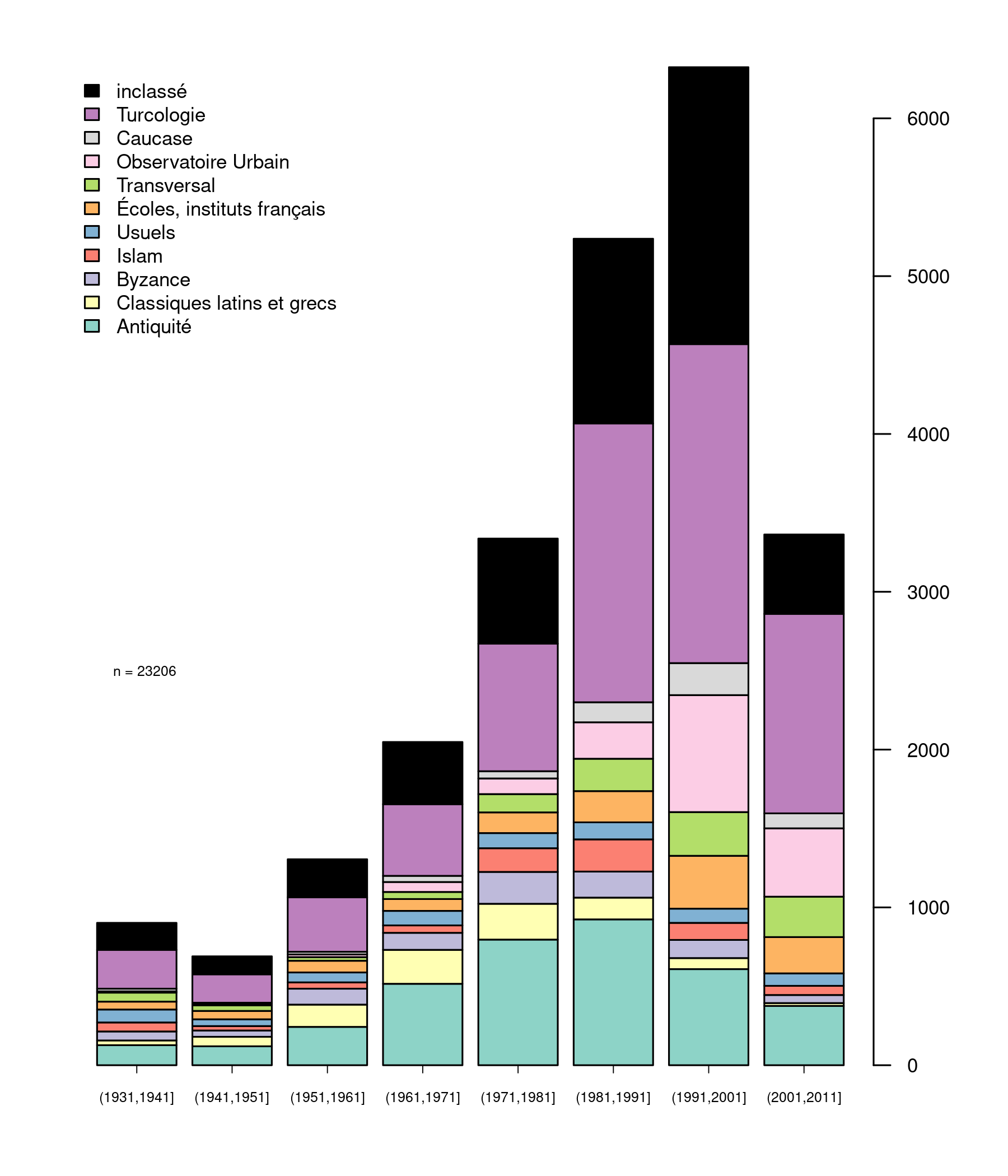 Ne serait-ce que par ses locaux, la bibliothèque de l’IFEA est un lieu idéal de travail et de découverte du riche patrimoine de l’Anatolie et des régions avoisinantes. Cette note explore le catalogue de la bibliothèque afin de donner une idée de l’étendue de ses collections et de son évolution, et présente quelques-unes de ses particularités. L’approche est holistique pour souligner les tendances qui se dessinent dans la longue durée, mais elle moins spécifique que les approches par fonds adoptées habituellement1 ou les présentoirs thématiques mensuels. Créée en 1931, la bibliothèque reflète de près le développement de l’institut, fondé comme Institut français d’archéologie d’Istanbul en 1930 et devenu Institut français d’études anatoliennes « Georges Dumézil » en 1975 (voir également l’historique de la bibliothèque et les extraits d’archives de la bibliothèque). La bibliothèque abrite quelque 30 000 ouvrages (et tirés à part) et environ 10 000 volumes de quelque 700 revues. Dans cette note, seul le catalogue des ouvrages (disponible en ligne) est analysé, laissant les revues de côté. L’étude quantitative du catalogue fait face à plusieurs problèmes puisque les données ne sont pas toujours homogènes, en particulier à cause du caractère polyglotte de la collection2; une partie du catalogue, environ 2000 ouvrages, n’est donc pas analysée et les chiffres reportés sont donc à considérer comme des minima. Par contre, la profusion de langages est l’une des grandes richesses de la collection.