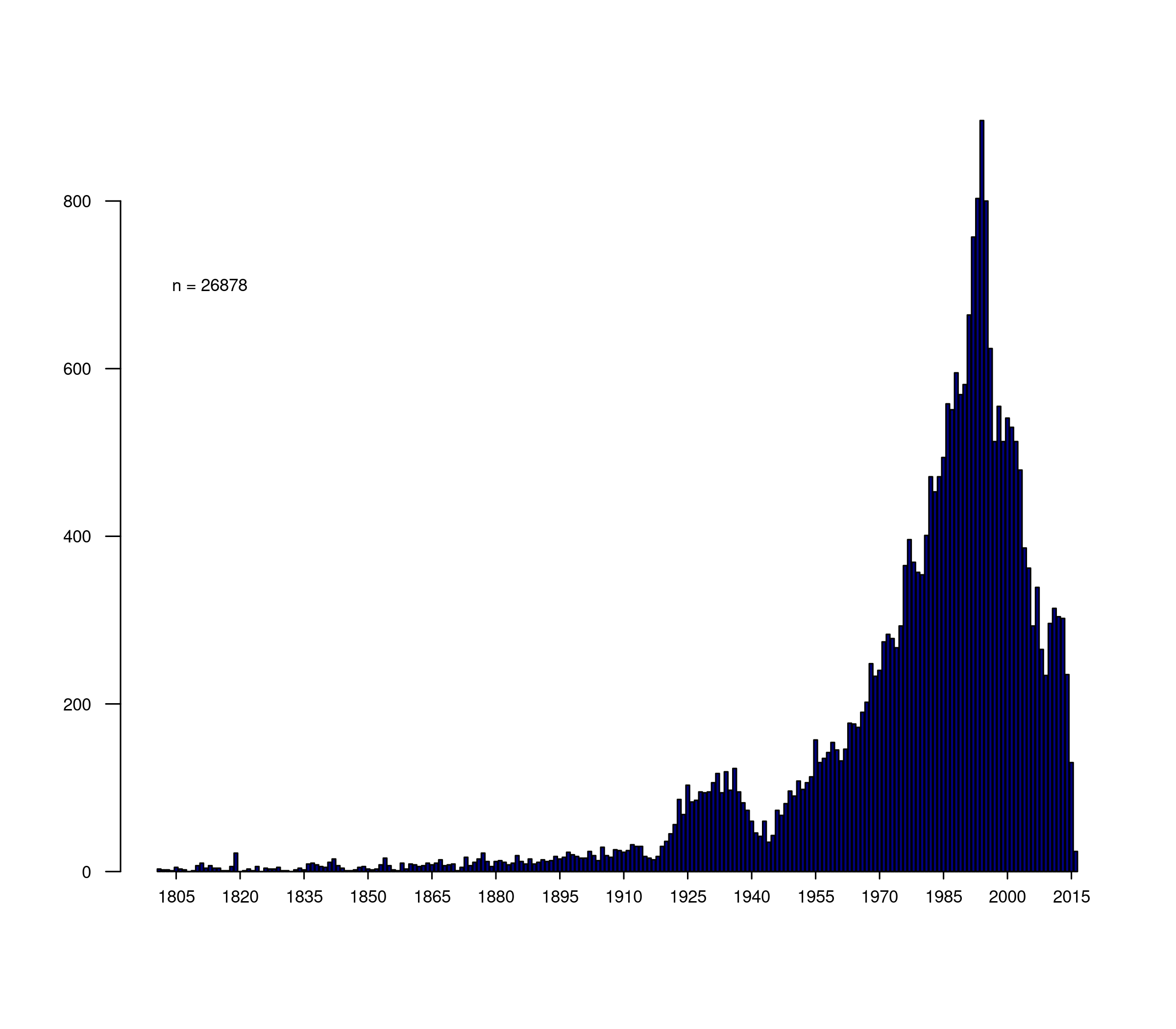 Même si les archives de la bibliothèque documentent les acquisitions, ces données ne sont pas disponibles dans le catalogue en ligne. En revanche, la distribution des ouvrages selon leur date de parution laisse entrevoir les grandes lignes du développement des collections (figure 6). Alors que les ouvrages antérieurs à la fondation de la bibliothèque (1931) sont peu nombreux par année, le nombre d’ouvrages par années de publication n’a cessé de croître régulièrement jusqu’en 1994 avec un pic à 900 ouvrages. Pour les dernières années du graphique, il faut considérer qu’il y a un certain décalage entre l’année de publication et l’entrée d’un ouvrage dans le catalogue. Les nombres d’ouvrages des années 2014-2016 vont donc encore largement augmenter. Néanmoins, le ralentissement de l’accroissement des collections de la bibliothèque est net et semble retomber au rythme d’acquisition des années 1970, une conséquence directe de la diminution des subventions de l’institut5. Du point de vue démographique, on pourrait dire que la bibliothèque est vieillissante.