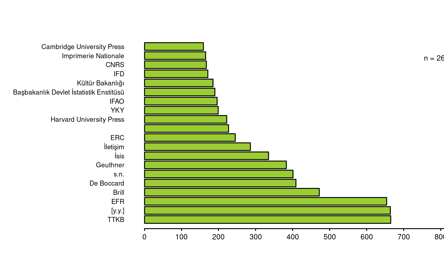 Le classement par maison d’édition, une catégorie bien renseignée dans la base de données, laisse entrevoir une autre particularité du fonds de la bibliothèque (figure 2). En effet, c’est la maison d’édition Les Belles Lettres qui est la mieux représentée. Cette collection témoigne du corpus important d’auteurs antiques, puisque sur les presque 900 ouvrages, la très grande majorité provient de la collection « Budé » qui comprend environ 800 volumes. Tout naturellement, les maisons d’édition turques sont bien représentées avec la Türk Tarih Kurum Basımevi (TTKB), İSİS Press (İsis), Yapı Kredi Yayınları (YKY) ou encore İLETİŞİM. Parmi les maisons d’édition françaises, on retrouve les librairies érudites De Boccard - le diffuseur actuel des publications de l’IFEA et un acteur ancien de la turcologie - et Geuthner, mais aussi de nombreuses institutions françaises comme l’École française de Rome (EFR), l’Institut français d’archéologie orientale (IFAO) - grâce à la politique d’échanges de l’Institut -, les presses du CNRS ou encore l’ancienne collection du ministère des Affaires étrangères pour la publication des missions archéologiques françaises à l’étranger Les Editions recherche sur les civilisations (ERC). Ces dernières montrent bien la fonction de relai que joue l’IFEA pour les publications françaises en Turquie et son rôle de chaînon dans le réseau des écoles et instituts français à l’étranger.