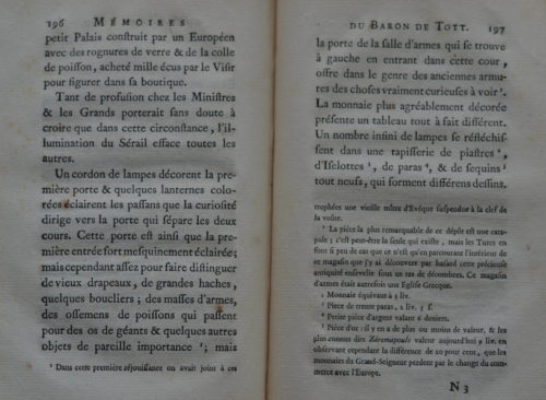 Lors des règnes suivant, ces collections ont subies plusieurs vicissitudes, mais des objets « de curiosité » ont continué à être entreposés là7. De cette époque date la mention par François de Tott dans ses « Mémoires du baron de Tott sur les Turcs et les Tartares », dont l’IFEA conserve un exemplaire de l’editio princeps8.